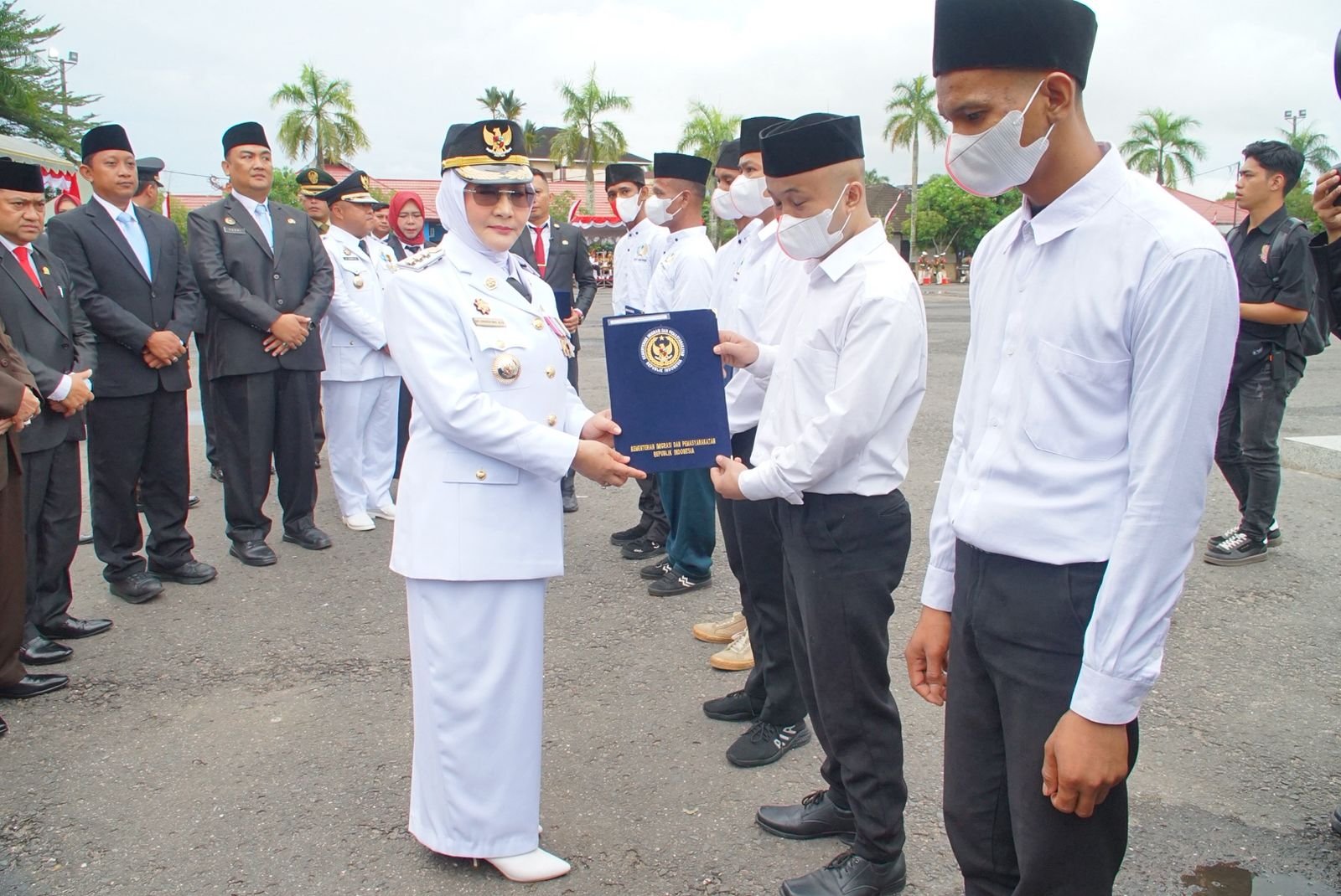 Seusainya melaksanakan dan memimpin upacara, Bupati Berau Sri Juniarsih Mas dan Wakil Bupati Berau Gamalis serta unsur Forkopimda membagikan ratusan Bendera Merah Putih kepada masyarakat yang lewat di Simpang-Simpang jalan.