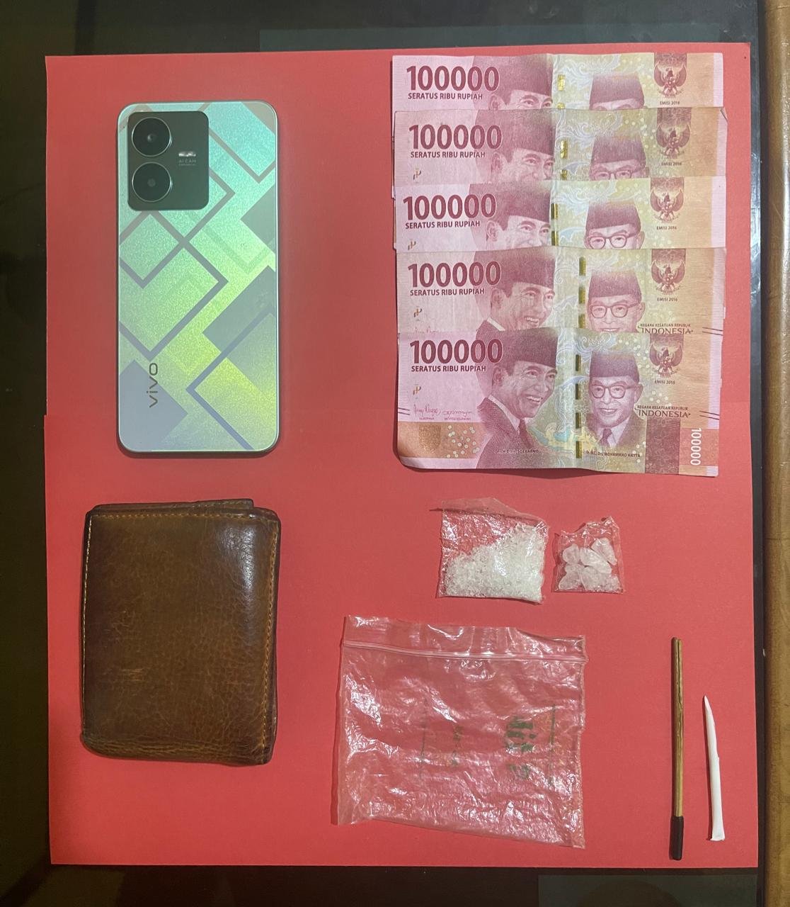 Dari tangan pelaku, petugas juga mengamankan barang bukti lain berupa satu sendok takar, uang tunai Rp500 ribu, satu unit telepon seluler, satu plastik klip.