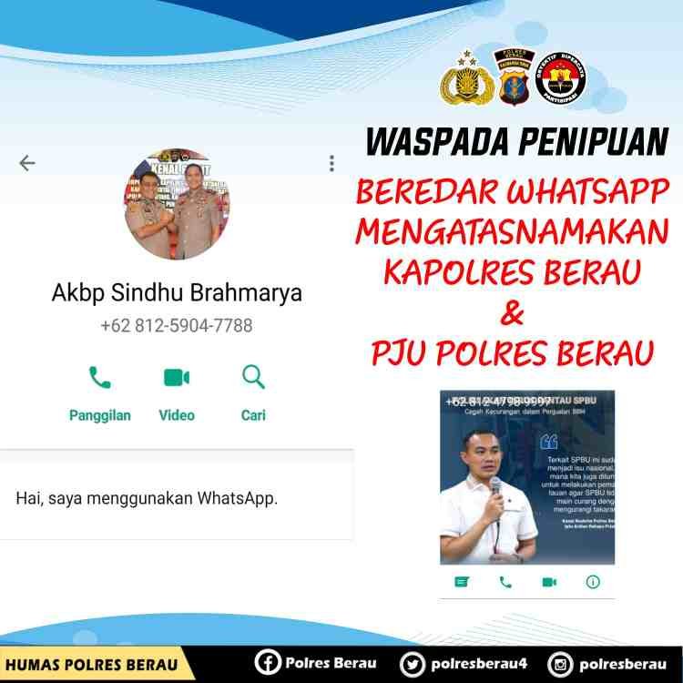 Untuk itu, Kapolres Berau meminta kepada seluruh masyarakat untuk tidak percaya bila menerima pesan WhatsApp yang mengatasnamakan dirinya, terlebih bila oknum tersebut meminta sejumlah uang dengan berbagai modus diantaranya lelang barang sitaan seperti mobil dan handphone.