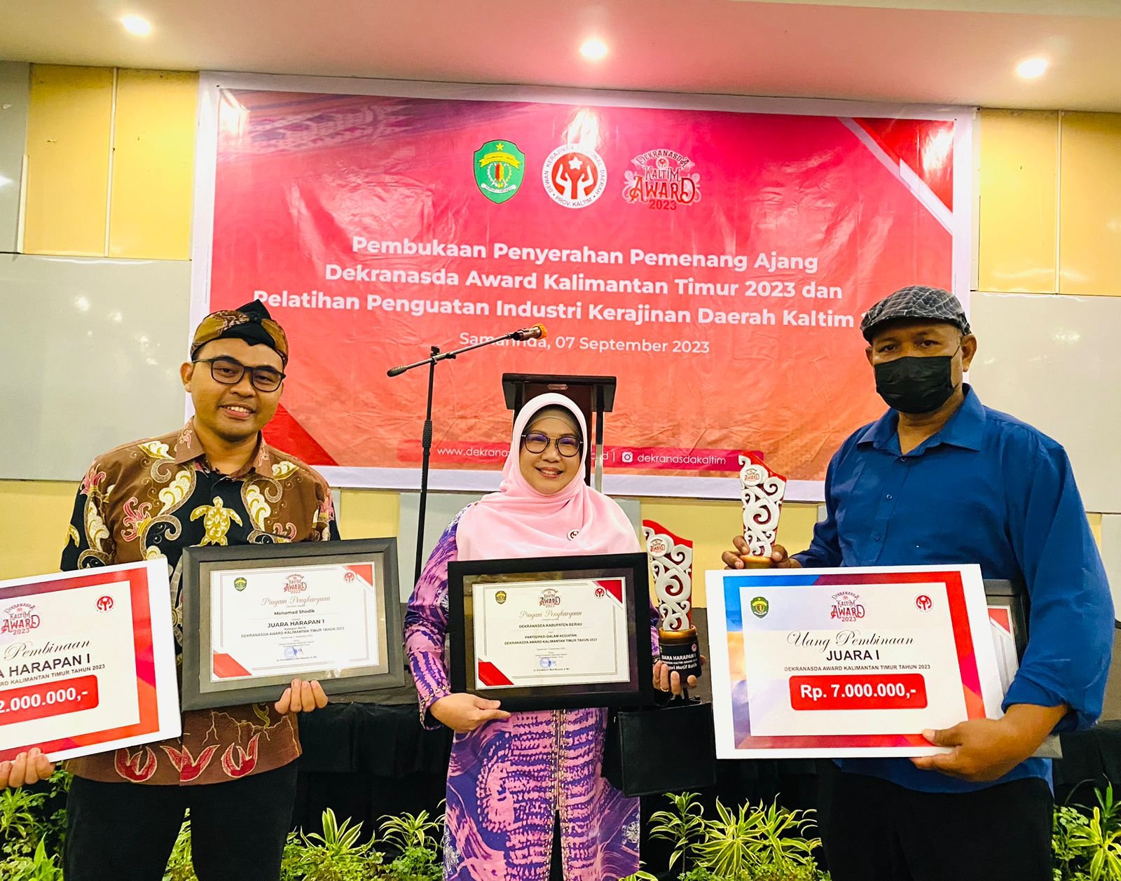 Penghargaan dan trophy diserahkan langsung oleh Ketua Dekranasda Kaltim, Erni Makmur Hadi Mulyadi, pada ajang Dekranasda Award dan Fasilitasi Pelatihan Penguatan Industri Kerajinana Kaltim di Haris Hotel Samarinda, Kamis (7/9/2023.