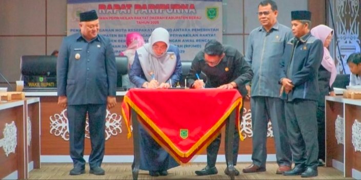 BERAUONLINE .COM, TANJUNG REDEB – Pemerintah Kabupaten Berau dan DPRD Berau menandatangi nota kesepakatan (MoU) rencana awal rencana pembangunan jangka menengah daerah (RPJMD) Kabupaten Berau tahun 2025-2029. Penandatanganan MoU ini dilaksanakan melalui rapat paripurna di DPRD Berau, Rabu (4/6/2025) antara Bupati Berau, Sri Juniarsih Mas dan Ketua DPRD Berau, Dedy Okto Nuryanto serta Wakil Ketua I dan II DPRD.